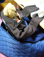 古い愛用品だったその寝袋、ついには両肩の縫い目がほどかれて、そこから手が出るようになりました。そして、ちょっとトンがった頭の部分をかぶってチャックを閉めれば…